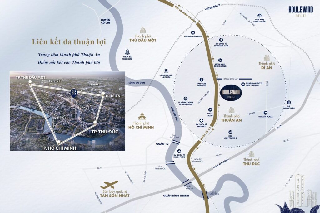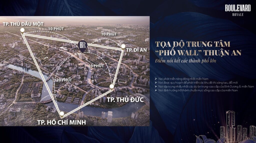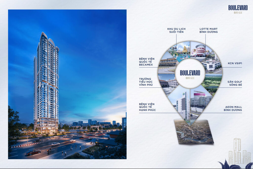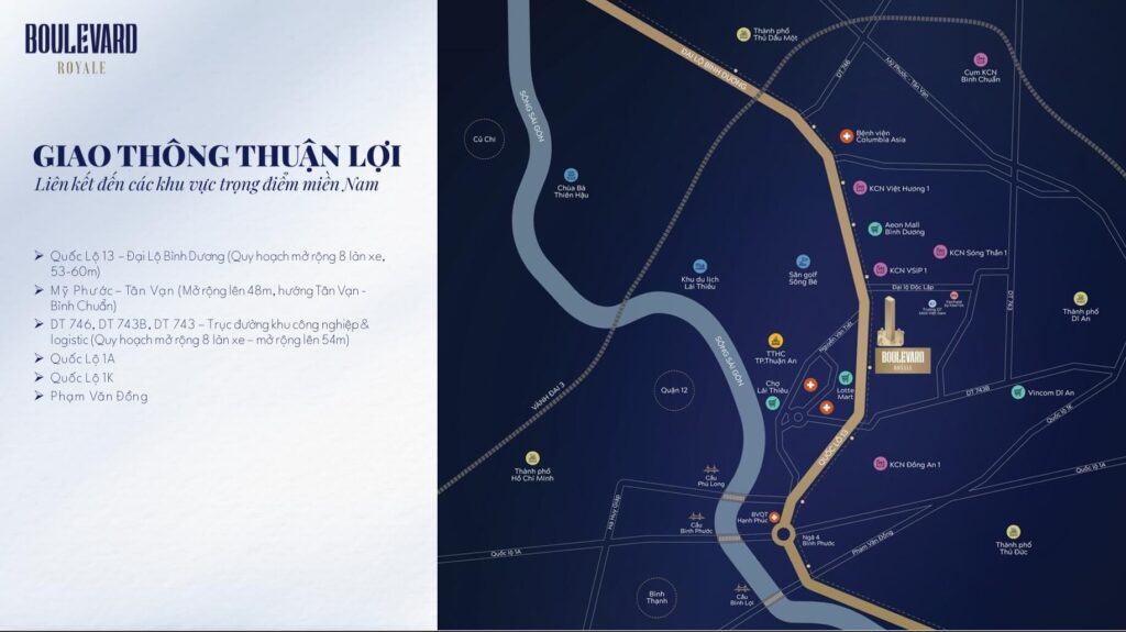 Với địa thế độc tôn, Boulevard Royale Thuận An Bình Dương thu hút nhà đầu tư bởi toạ lạc ngay quỹ đất vàng mặt tiền Quốc Lộ 13 trải dài hơn 300m, tiếp giáp với 04 thành phố lớn: TPHCM – Dĩ An – Thủ Dầu Một – TP Thủ Đức; liền kề KCN với quy mô Quốc tế VSIP 1, Việt Hương 1. Đặc biệt, trong vòng 5 phút cư dân đô thị sống tại Boulevard Royale di chuyển đến Lotte Mart, Aeon Mall, sân Golf Sông Bé, Bệnh Viện Becamex.