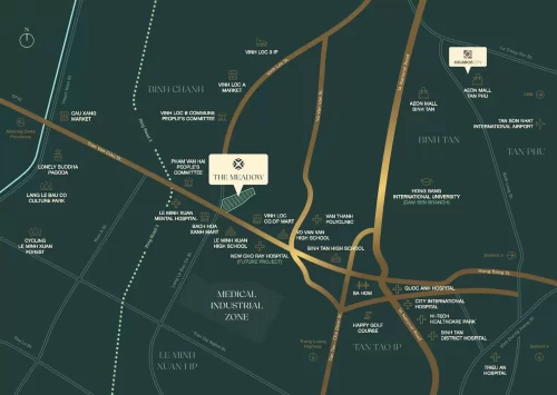 Dự án The Meadow tọa lạc ngay nút giao Đại lộ Trần Văn Giàu và Đường Vĩnh Lộc, Xã Vĩnh Lộc B, Bình Chánh, Thành Phố Hồ Chí Minh. Đây là dự án đầu tiên tiên tại khu vực Bình Chánh – Tây Nam TP. Hồ Chí Minh theo mô hình Compound với pháp lý hoàn thiện 100%, sổ riêng từng căn với đầy đủ tiện ích sống chuẩn Quốc tế và bàn giao theo tiêu chuẩn Lotus.